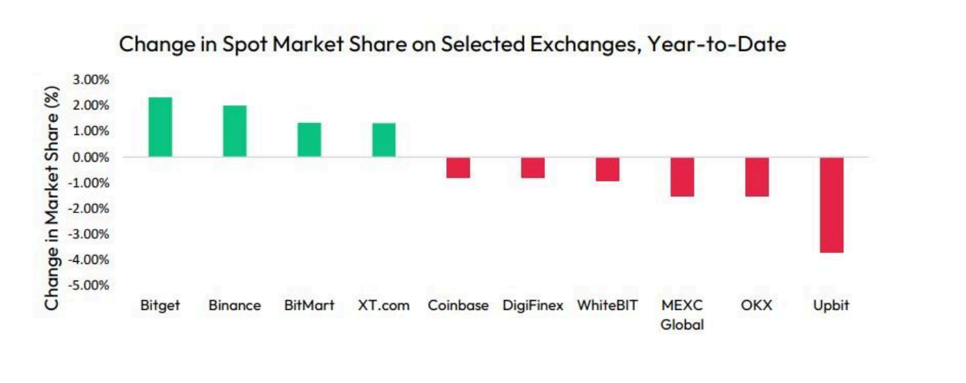 On a Year-to-Date basis, Bitget took the lead in the market with the largest gains in spot markets. Within this period, the exchange’s market share rose by 2.01% to 38%. Surprisingly, Bitget’s YTD market share surpassed that of Binance at 33.8% as Upbit and OKX saw negative slips to 3.73% and 1.54% respectively.