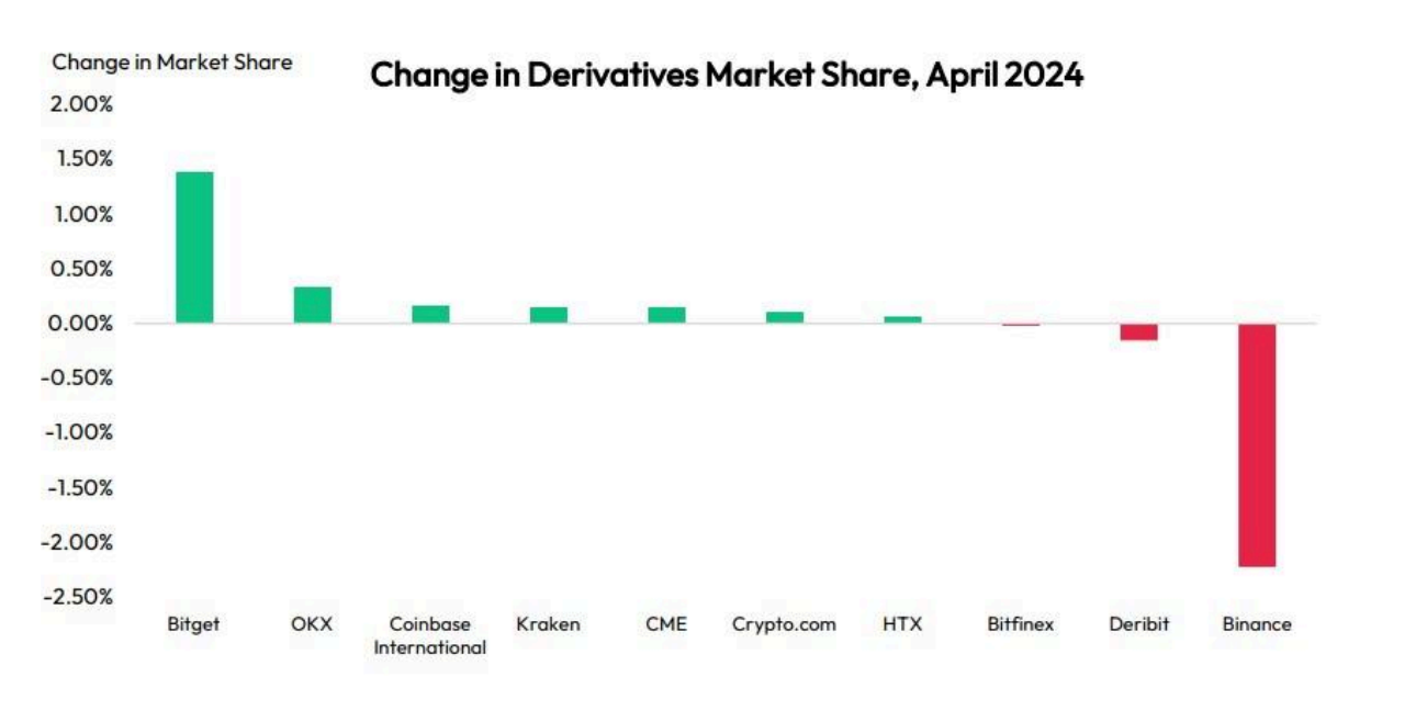 Per the change in derivatives market share for April, Bitget took the decisive lead, according to the CCData report. Bitget’s share increased by 1.39% to 14.3%. Though Binance is still the largest derivatives exchange, its market share dominance dropped by 2.22% to 44.4%.