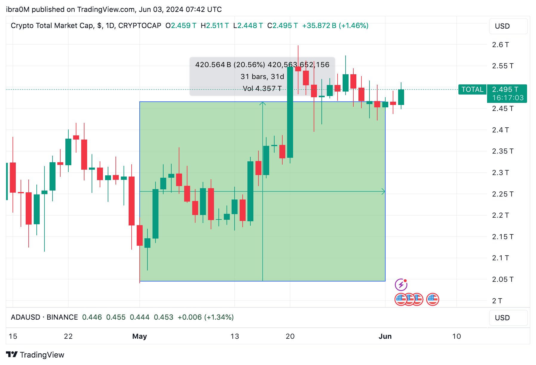 Crypto Market Capitalization (TOTALCAP) grew $420 billion in May 2024